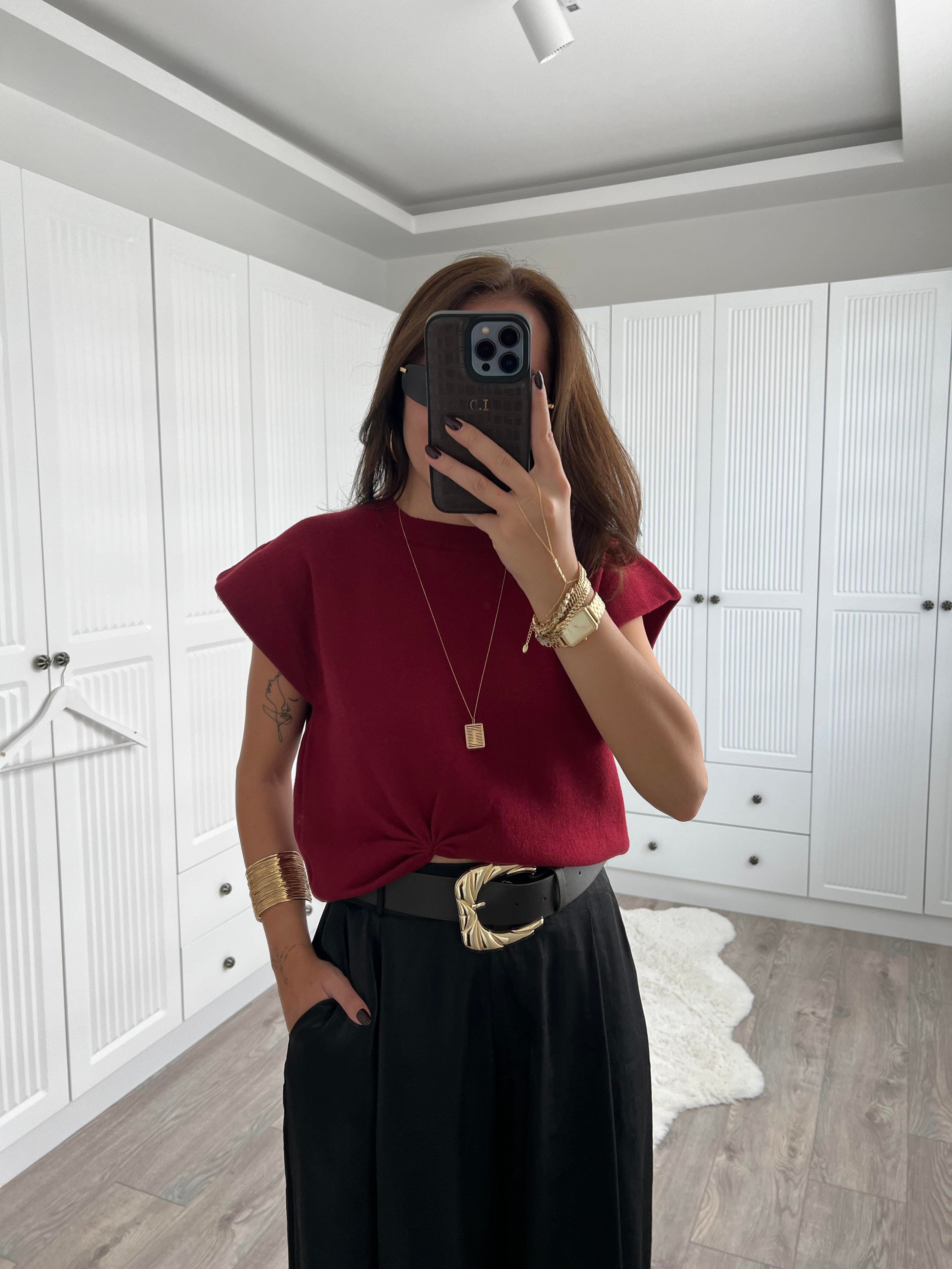 Çelik Triko Büzgülü Bordo Triko Bluz