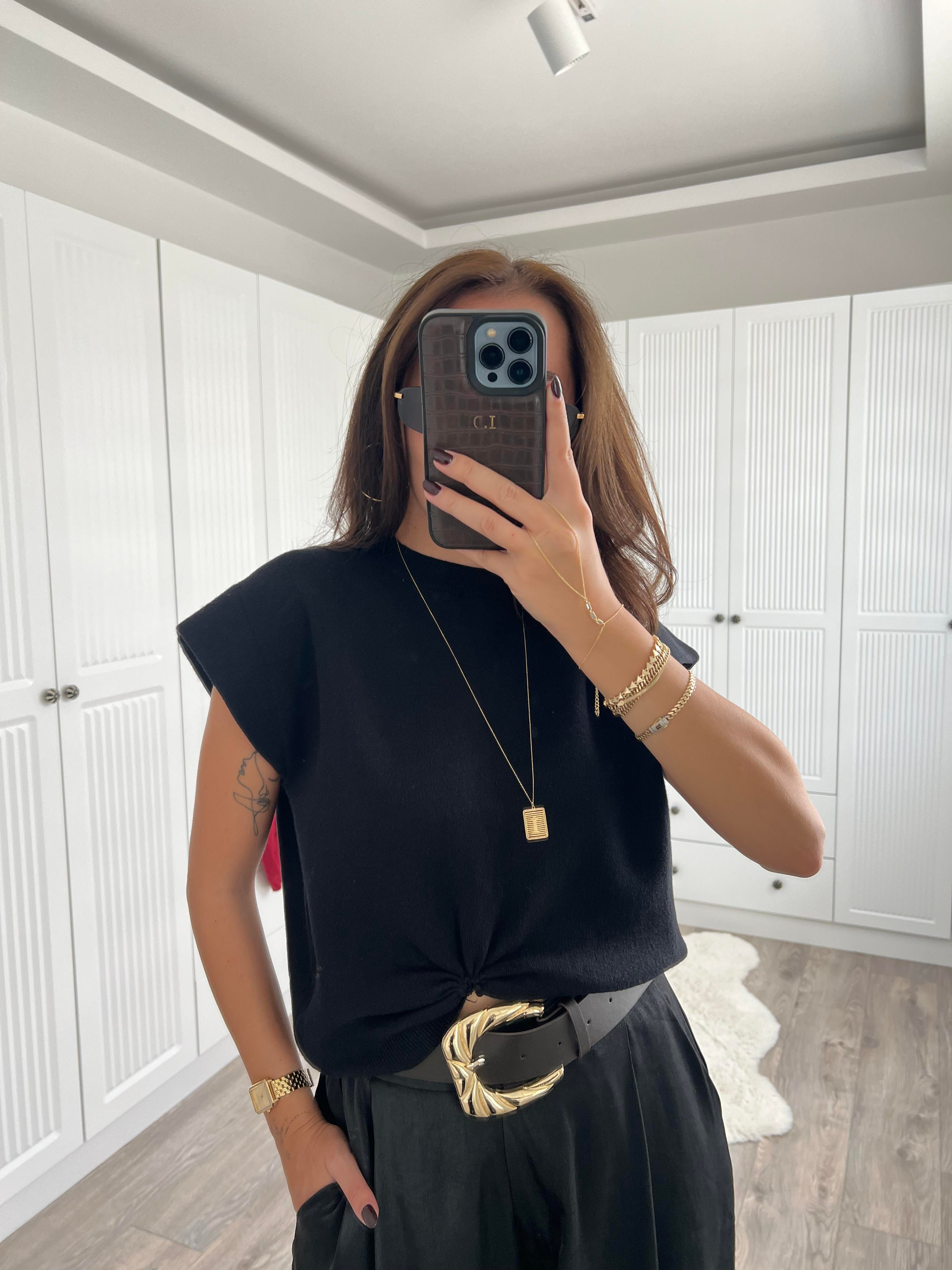 Çelik Triko Büzgülü Siyah Triko Bluz