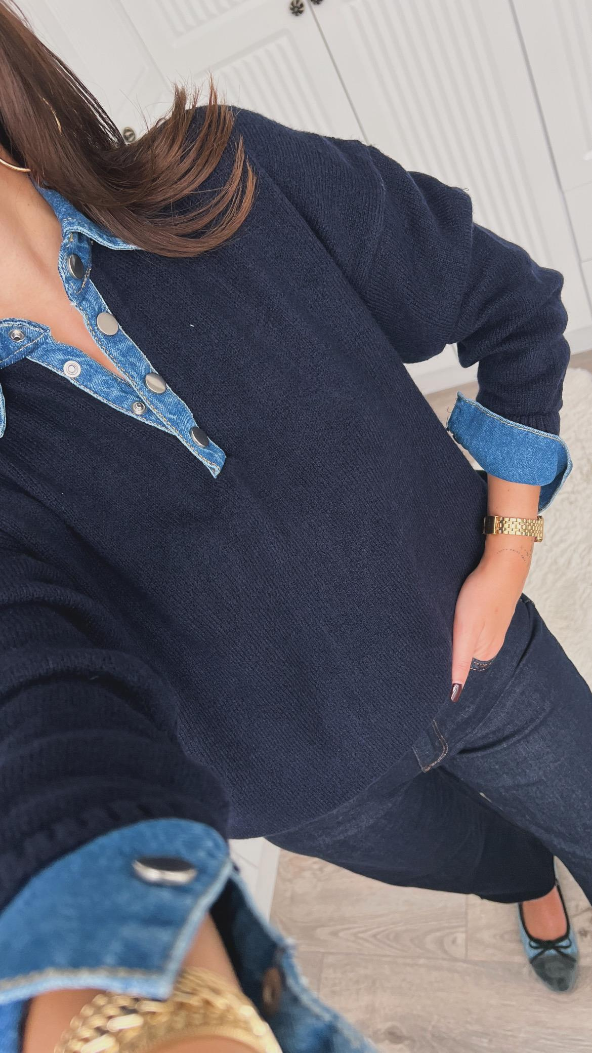 Jean Detaylı Polo Yaka Lacivert Kazak