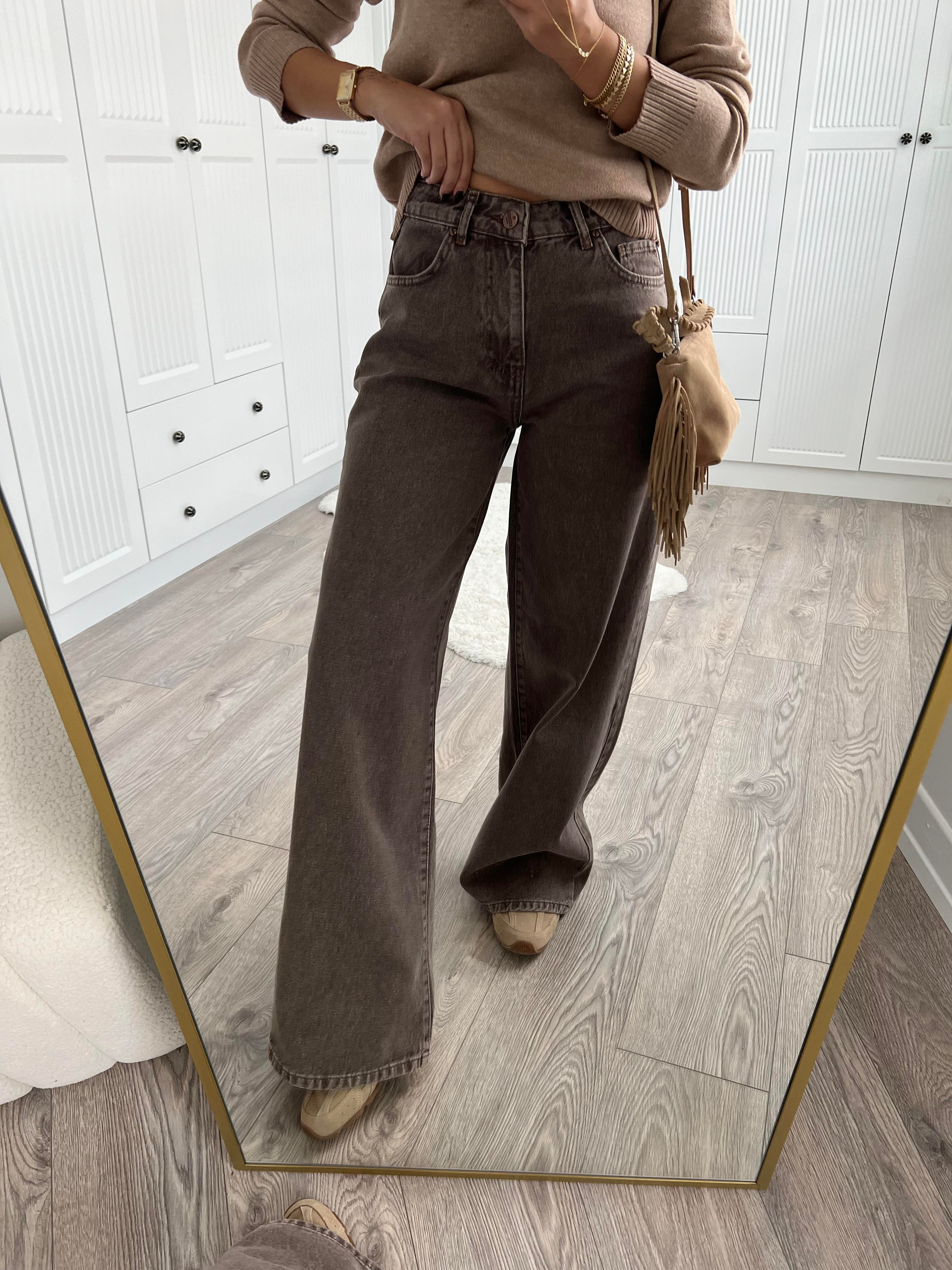 Kahve Taşlanmış Geniş Paça Jean